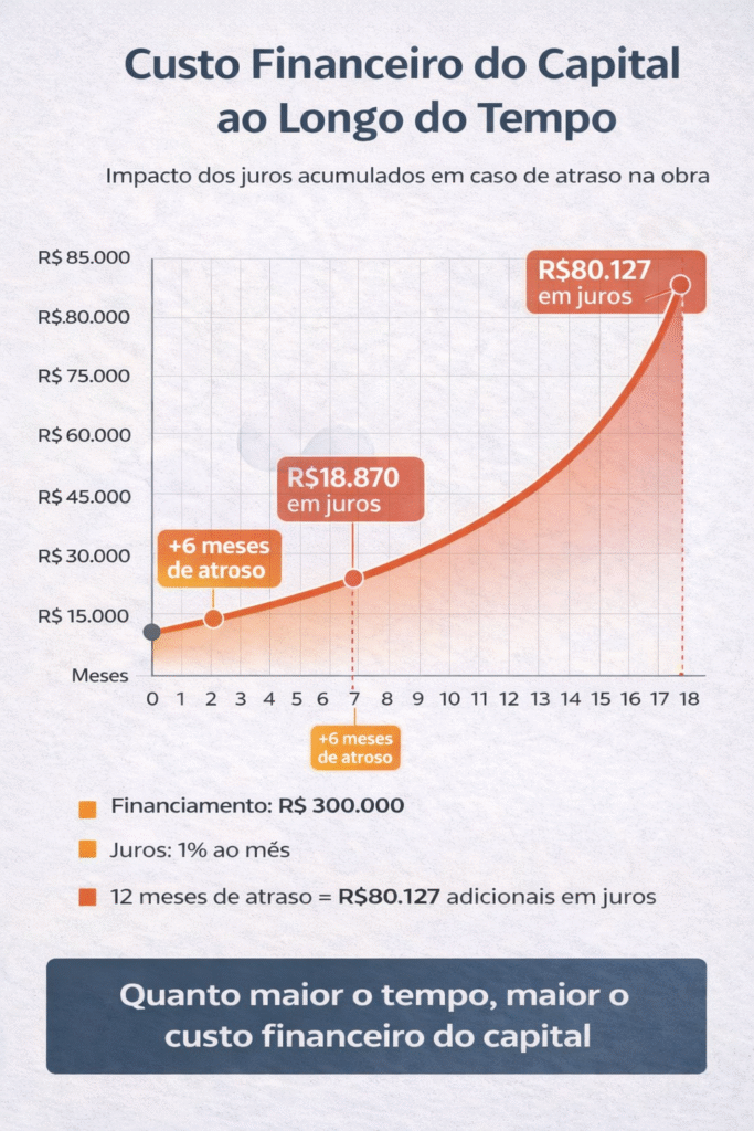 Além disso, existe o custo financeiro do capital investido. Em projetos financiados, cada mês adicional de obra representa mais juros pagos. Mesmo em projetos com capital próprio, o tempo prolongado significa que o dinheiro está imobilizado por mais tempo, deixando de ser utilizado em outras oportunidades. Esse conceito, conhecido como custo de oportunidade, é um dos fatores mais relevantes quando se analisa a eficiência de um investimento em construção.