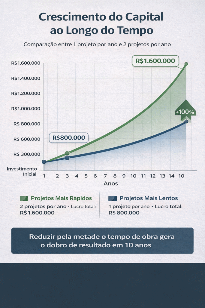 Para ilustrar esse ponto, considere dois cenários com o mesmo valor de investimento inicial. No primeiro, a obra leva doze meses para ser concluída. No segundo, o mesmo projeto é executado em seis meses. No cenário mais rápido, o capital retorna mais cedo, permitindo reinvestimento ou utilização do imóvel. No cenário mais lento, o capital permanece imobilizado por um período maior, reduzindo sua eficiência ao longo do tempo. Essa diferença, quando acumulada ao longo de múltiplos ciclos de construção, torna-se exponencial.